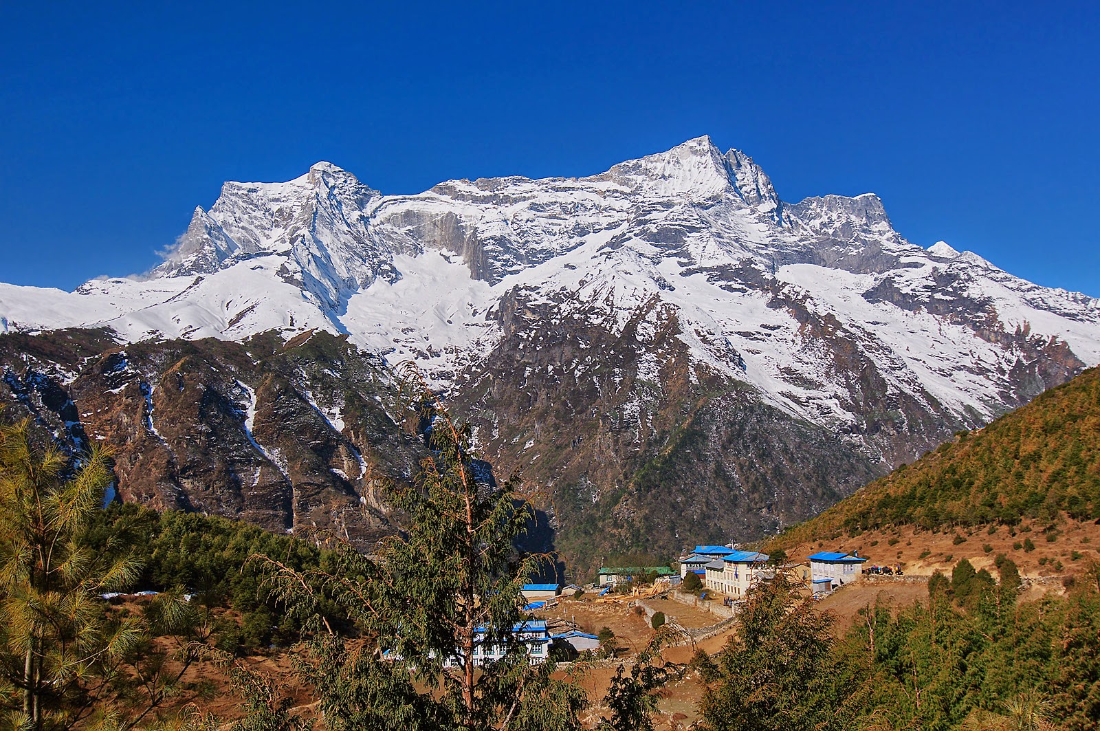 照片後方有兩座有名的山峰,左邊為 甘地嘉峰 (Kangtega, 6,782M),因山形獨特像一座馬鞍,其雪巴語意為「鞍之雪山」。 右邊為唐瑟古峰 (Thamserku, 6,623M),兩座山都是具有挑戰性的高山,每年都有登山隊伍前往登頂。